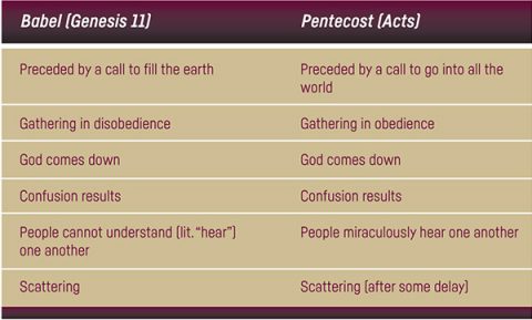 The fulfillment language of Acts 2:1 (and the numerous other fulfillment formulas included in the New Testament) remind the reader that the divine plan did not come to an abrupt end with the arrival of the Messiah. Rather, it represents a fulfillment of the promise given in Acts 1:4. Verse 2 describes a powerful sound “from heaven” that filled the house where the disciples were meeting. The Counselor promised by Jesus (John 14:16–18), the Holy Spirit, fills all present and they begin to speak in other “tongues” (Acts 2:4). This movement from heaven down to earth echoes the divine movement from heaven to earth in Genesis 11:5. And in line with Genesis where language became confused, Acts 2 involves speech that functions as some type of reversal from confusion (and lack of understanding) to understanding. Acts 2:6 and 7 note the surprise and shock of the multitude that gathered when hearing this strange sound, since all the visitors could hear the disciples speak in their own language. The links between Babel (Genesis 11) and Pentecost (Acts 2) can be summarized in the following table.8