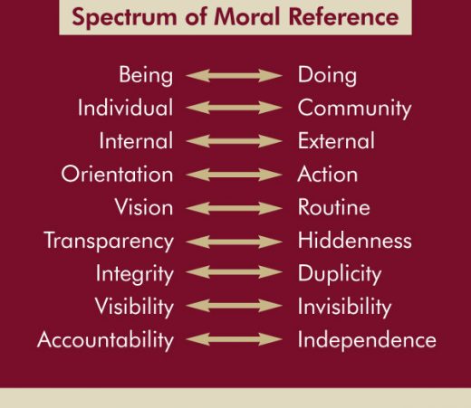 One’s personal spectrum blend on this matrix offers critical insight into his or her moral orientation and agency. Positioning oneself between the contrasting points can help highlight our moral being and action when no one sees. It reminds us of the issues involved in ethics for the invisible.