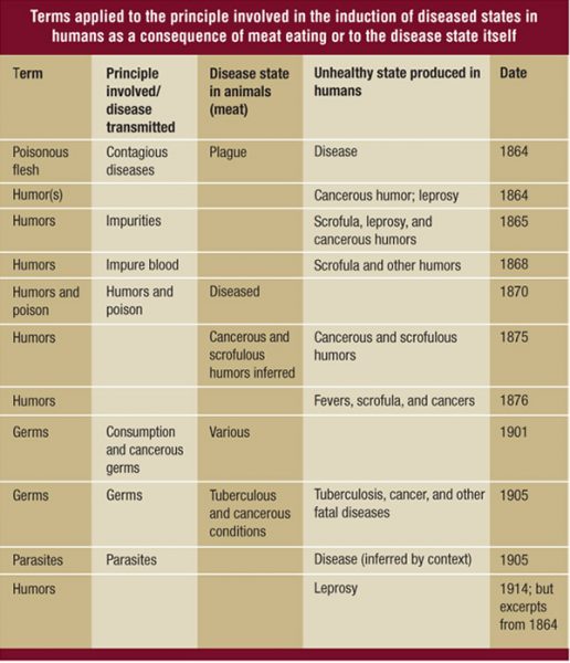 ● “The testimony of [meat] examiners is that very few animals are free from disease, and that the practice of eating largely of meat is contracting diseases of all kinds,―cancers, tumors, scrofula, tuberculosis, and numbers of other like affections”10(1897).