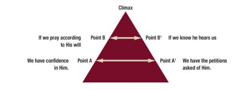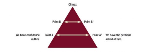 This is the context for the promise found in 1 John 5:14 and 15. These verses form what Bible scholars call a chiasm,2 an inverted parallelism read from the base upward to the climax, or conclusion. The first point in the statement corresponds with, or is paralleled to, the last point in the statement. The second point mirrors the next-to-the-last point in the statement, and so on. Eventually, the climax—the main point of a statement—is found at the top center of the statement. This is illustrated below: