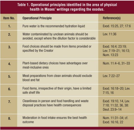 Ellen White took the Exodus experience as her reference point in the health vision and God’s instruction given there for developing an understanding of their significance. These principles are designed to assist in enjoying a pleasant life and a vigorous spiritual experience. The operational principles during the Exodus event identified here in the area of physical health are shown in Table 1.