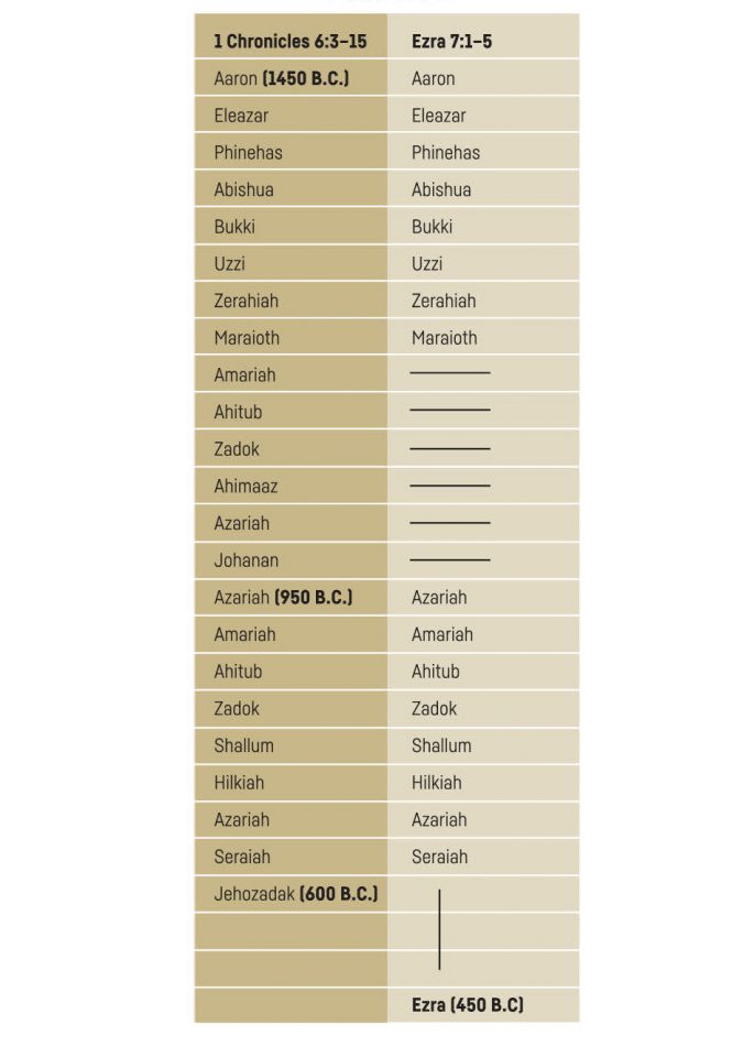 3. Comparing Ezra 7:1 to 5 with 1 Chronicles 6:3 to 15, Ezra leaves out six names following Maraioth and several names between Seraiah and Ezra: