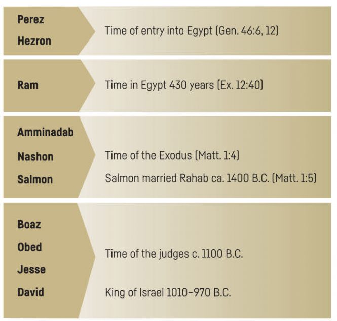 4. David’s genealogy in Ruth 4:18 to 22 also has large gaps. Two names are listed entering Egypt in 1880 B.C.; one name is given during the 430 years in Egypt, and three names are recorded at the time of the Exodus in 1450 B.C. Finally, three names are registered during the period of the judges, as well as David:
