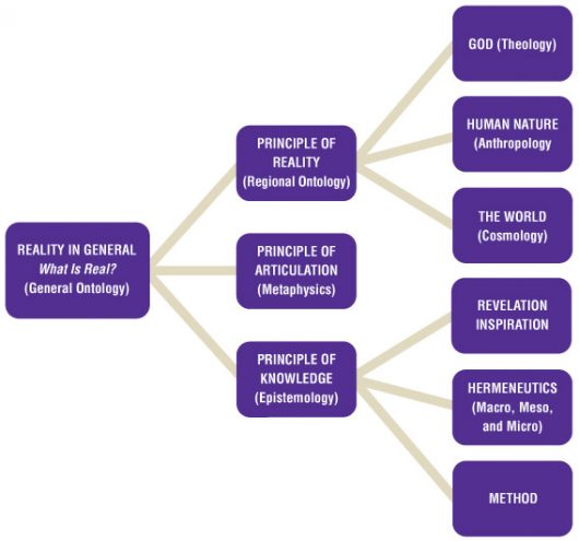 Every teaching or belief begins with grounding assumptions—known or unconscious—regarding ultimate reality. Every single person, whether aware of it or not, has these basic assumptions about reality. This is simply the structure of human reason. These basic assumptions may be grounded in the study of Scripture, other books, or simply absorbed through one’s culture. The quest to define these basic presuppositions is philosophical because it explores the nature of reality at its core. The basic question explored by general ontology is What is real? In regional ontology, theology studies the nature and revelation of God, anthropology looks at the origin and nature of nature of human beings, and cosmology studies the origin and nature of the cosmos. Epistemology then explores human knowledge in relation to revelation-inspiration, hermeneutics, and method. Finally, metaphysics explores the way all of these parts unite in a coherent totality or whole.