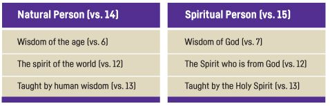 This text presents certain concepts equated and then contrasted with their opposites (see table below). The “wisdom of God” is identified with “the Spirit who is from God,” which “the Holy Spirit teaches.” These are contrasted with the “wisdom of the age” or “human wisdom,” which is identified with “the spirit of the world,” that is also the wisdom or philosophy taught by the rulers of this age. Paul designates as spiritual as the one having the mind of Christ through the teaching of the Holy Spirit (vs. 15), but the one who is led by the wisdom/spirit of the age he calls natural (vs. 12).